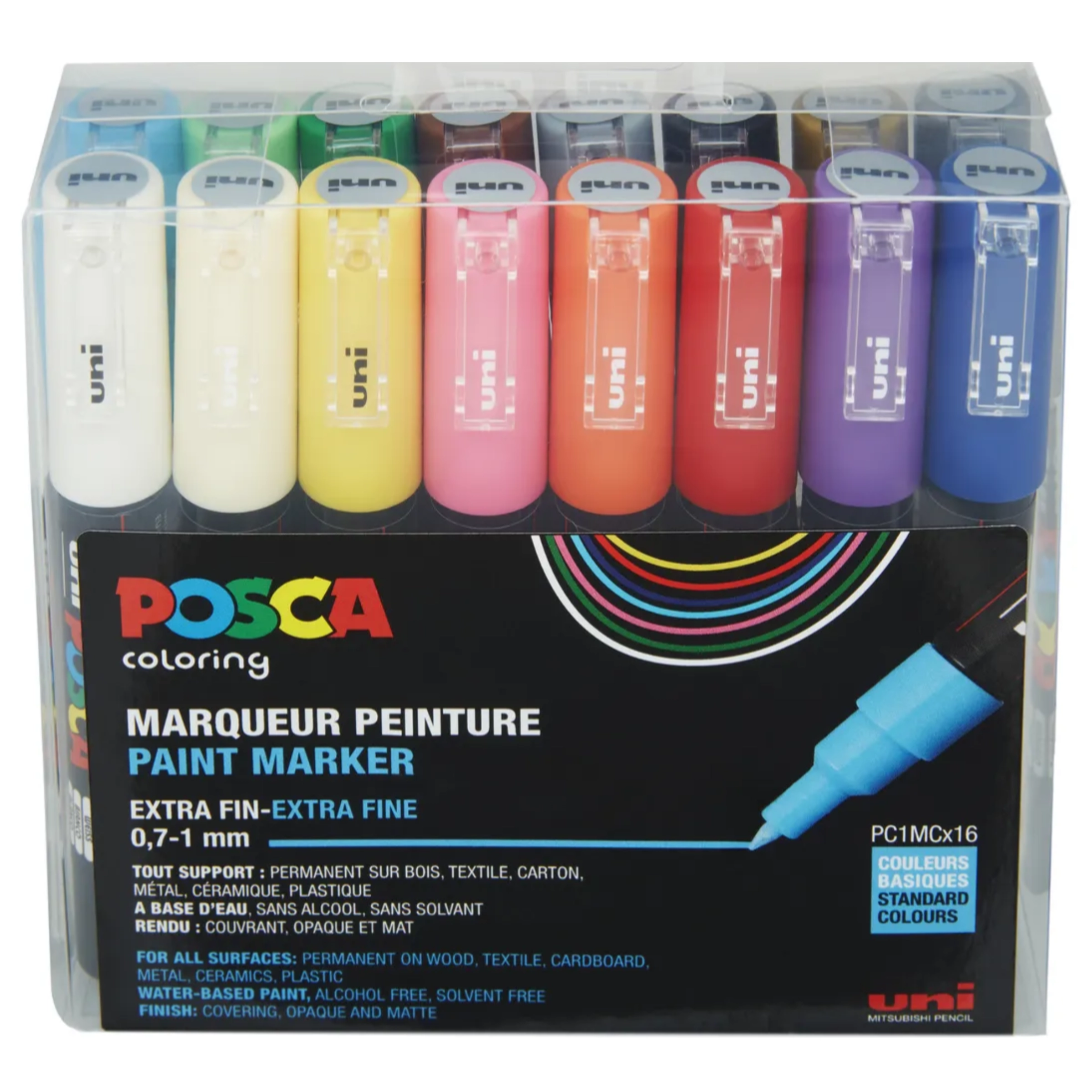The Posca PC-1MC is an acrylic marker with a 1 mm extra-fine bullet tip that writes on almost any surface, indoors and outdoors. The ink is quick drying, UV resistant and of a stable pigment, the marker can be used for all types of creative work.