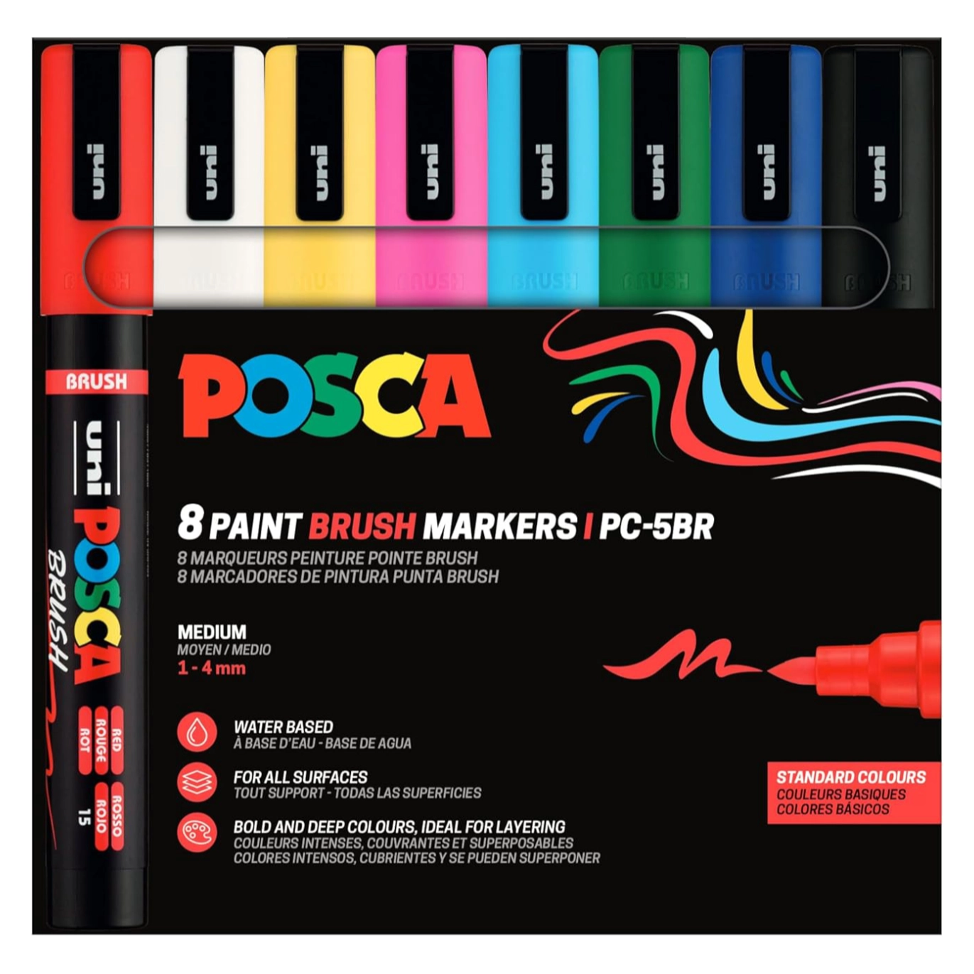 The Posca PC-5BR is an acrylic marker with a brush tip that writes on almost any surface, indoors and outdoors. The ink is quick drying, UV resistant and of a stable pigment, the marker can be used for all types of creative work but is especially designed to function a bit similar to a paint brush!